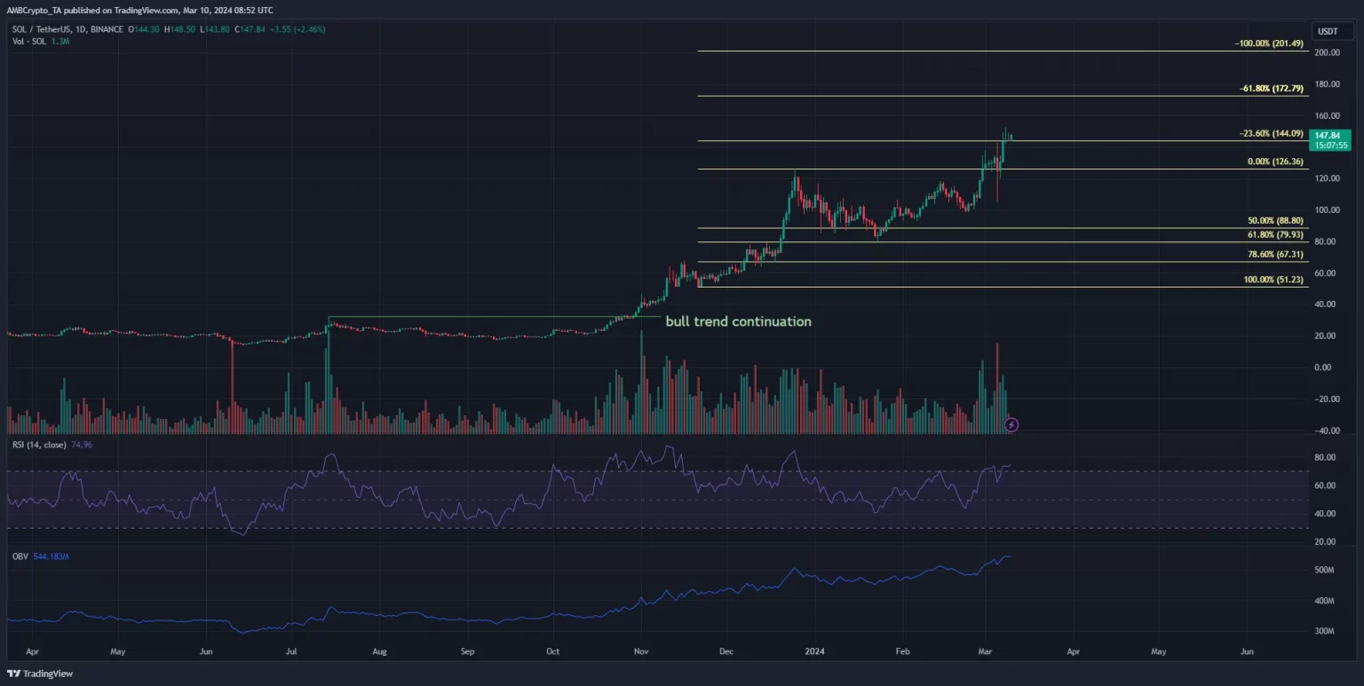 El nivel del 61,8% en 79,93 dólares se volvió a probar como soporte en enero antes de que continuara el repunte. Esta señal llegó a principios de marzo, cuando SOL superó el máximo anterior de 126,36 dólares.