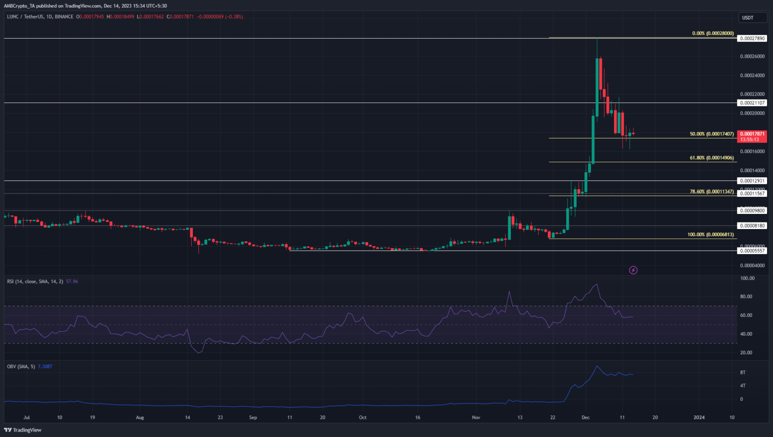 Terra Clásico [LUNC] tuvo un enorme repunte y un posterior retroceso en las últimas tres semanas. LUNC aumentó un 310% en dos semanas y comenzó a retroceder el 4 de diciembre.