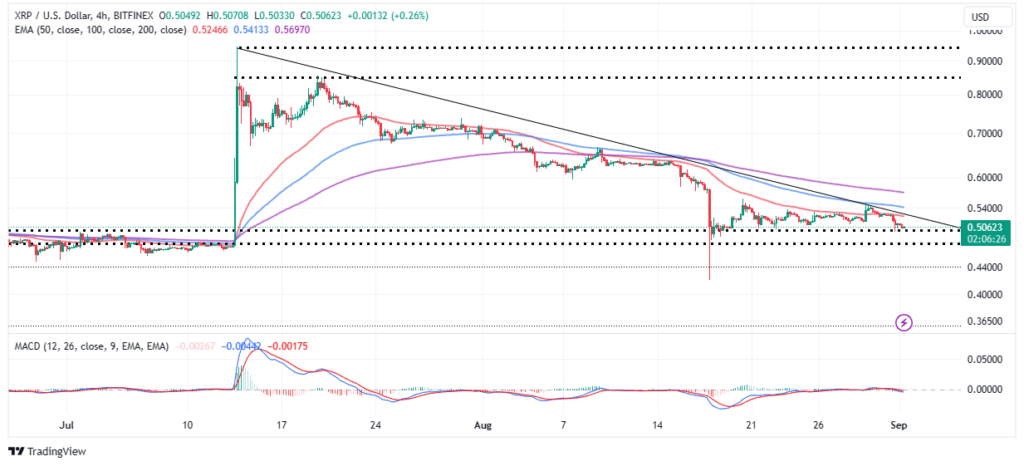 Después de verse obligado a abandonar su caso alcista con el objetivo de una ruptura a 1 dólar a 0,54 dólares, el precio de XRP está luchando por mantener el soporte en 0,5 dólares. La liquidación de agosto, además de recortar las ganancias de 0,93 dólares a los niveles anteriores a Ripple frente a la norma de la SEC, ha privado al token de remesas de dinero transfronterizas del impulso para sostener un rebote.