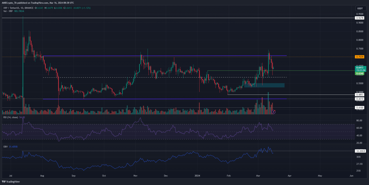 El gráfico diario de XRP mostró que a pesar del retroceso cercano al 15% en los últimos cinco días, la estructura del mercado se mantuvo alcista. Es necesario un movimiento por debajo de USD 0,525 para cambiar esto.