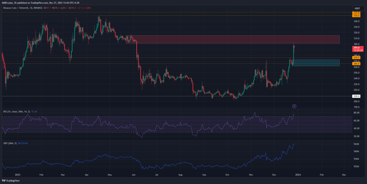 moneda binance [BNB] Estalló más allá de una zona de resistencia significativa el 26 de diciembre. Pasó de 266 dólares a 303,2 dólares en un día, un movimiento del 14,85%. En el momento de esta publicación, los precios de BNB estaban por debajo de la marca de $ 300.