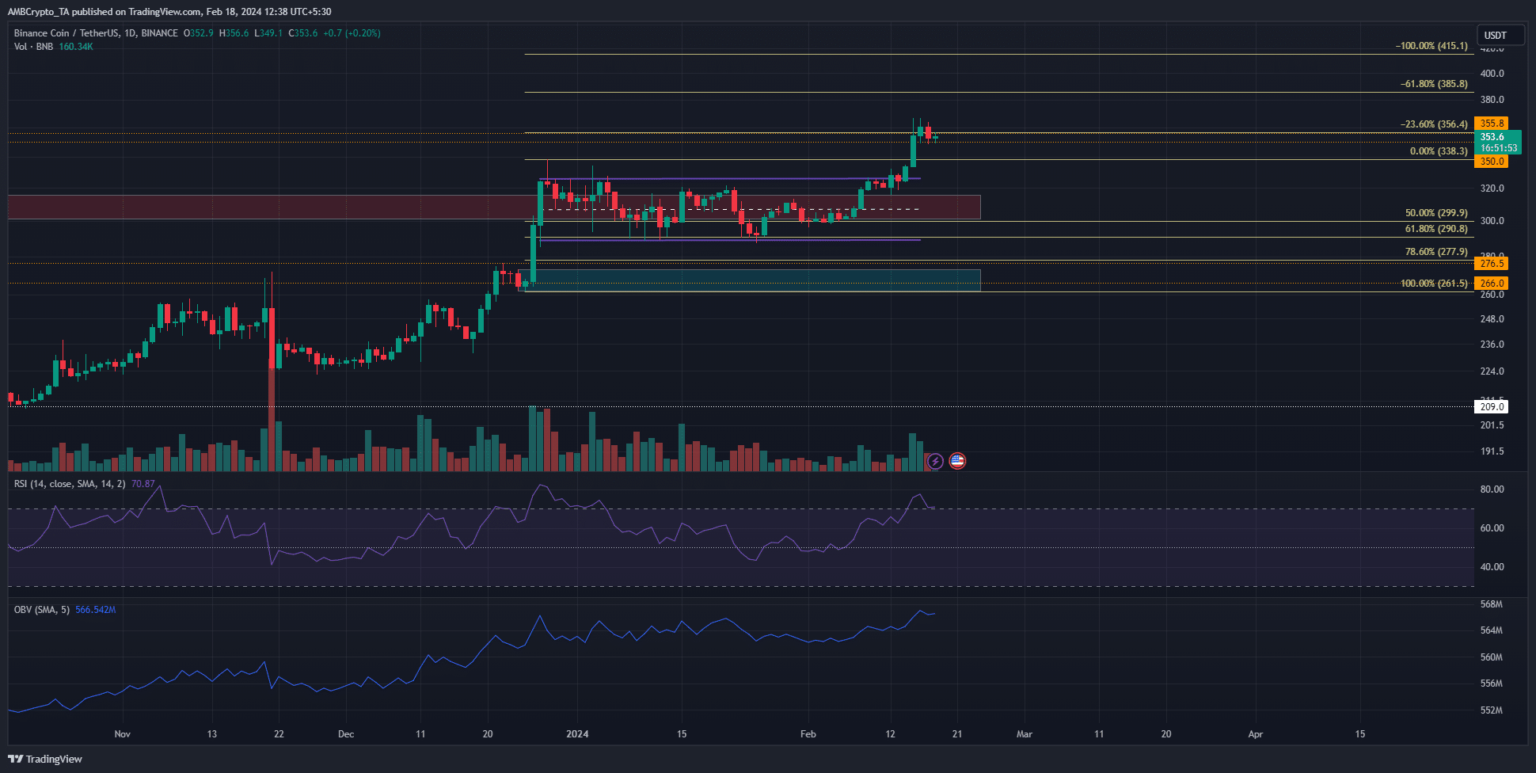 moneda binance [BNB] tenía un fuerte sesgo alcista en el gráfico de precios de un día. Superó los máximos del rango de dos meses de 325 dólares y subió hasta 366 dólares.