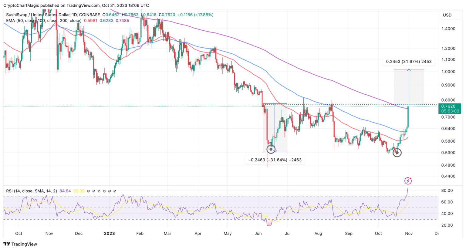 El posterior ascenso por encima de la resistencia de la EMA (azul) de 100 días allanó el camino para la acción alcista en curso en una vela envolvente, acercando a Sushi a una ruptura del patrón de doble fondo.