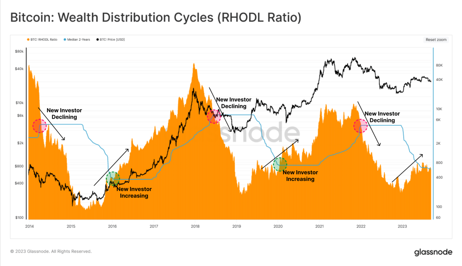 De acuerdo a Para Glassnode, el índice HODL realizado (RHODL) sirve como un indicador crucial del sentimiento del mercado. Mide el equilibrio entre las inversiones en monedas recientemente movidas (aquellas mantenidas por menos de una semana) y aquellas en manos de HODLers a más largo plazo (mantenidas por 1-2 años). El ratio RHODL para el año 2023 coquetea con el nivel medio de 2 años. Si bien esto indica una modesta afluencia de nuevos inversores, el impulso detrás de este cambio sigue siendo relativamente débil.