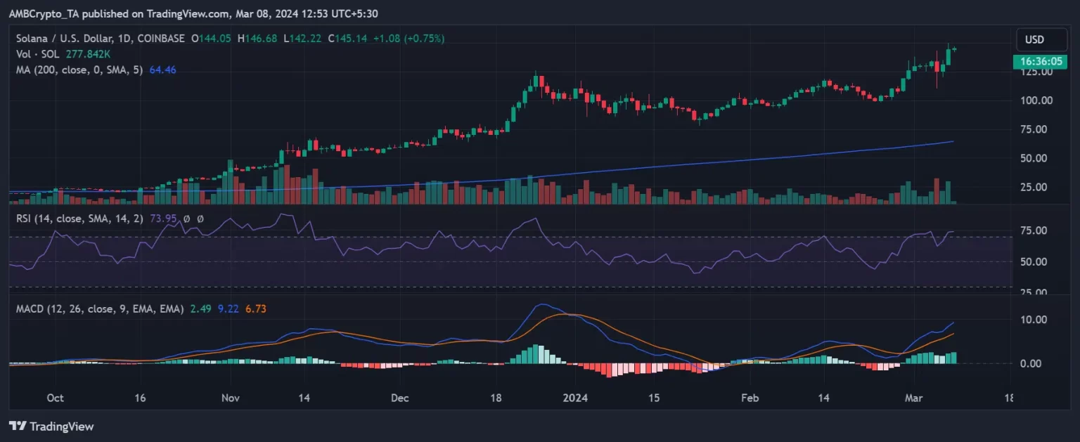 El examen de Solana en un gráfico de tiempo diario revela que al final de la negociación el 7 de marzo, experimentó un aumento notable de más del 10%.