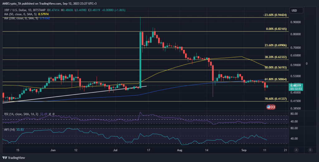 Aunque los anuncios anteriores subrayan un futuro brillante para Ripple, el desempeño de XRP sigue siendo deficiente. De hecho, cayó a un precio notable durante la sesión de negociación del lunes (11 de septiembre). XRP cayó hasta 0,45 dólares, un nivel de precio visto anteriormente antes de que se anunciara la victoria de Ripple contra la SEC. Cambió de manos a 0,48 dólares en el momento de escribir este artículo.