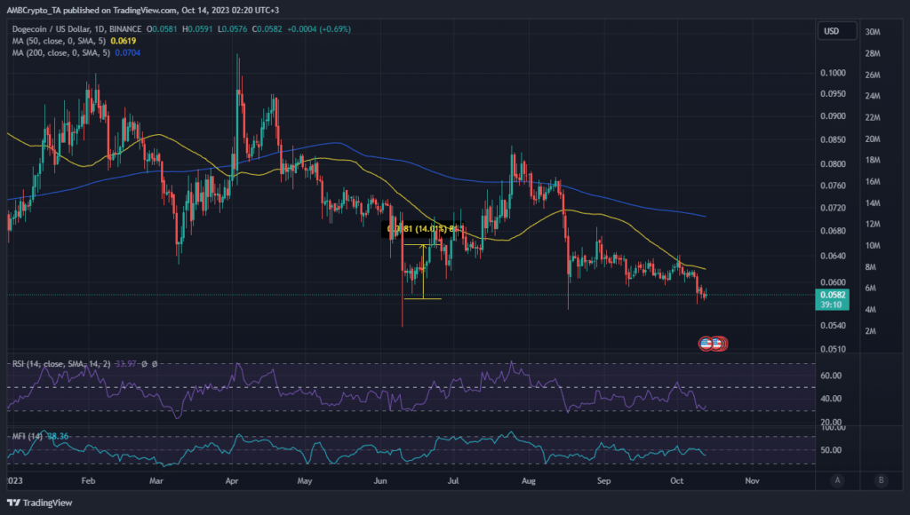 La perspectiva a corto plazo de DOGE sugirió que podría haber más presión de venta en juego, ya que aún no había caído en territorio de sobreventa. El próximo rango de soporte a corto plazo podría ocurrir entre el rango de precios de $ 0,056 a $ 0,053 si prevalece la presión de venta. Dogecoin cambió de manos a 0,058 dólares al momento de esta publicación.
