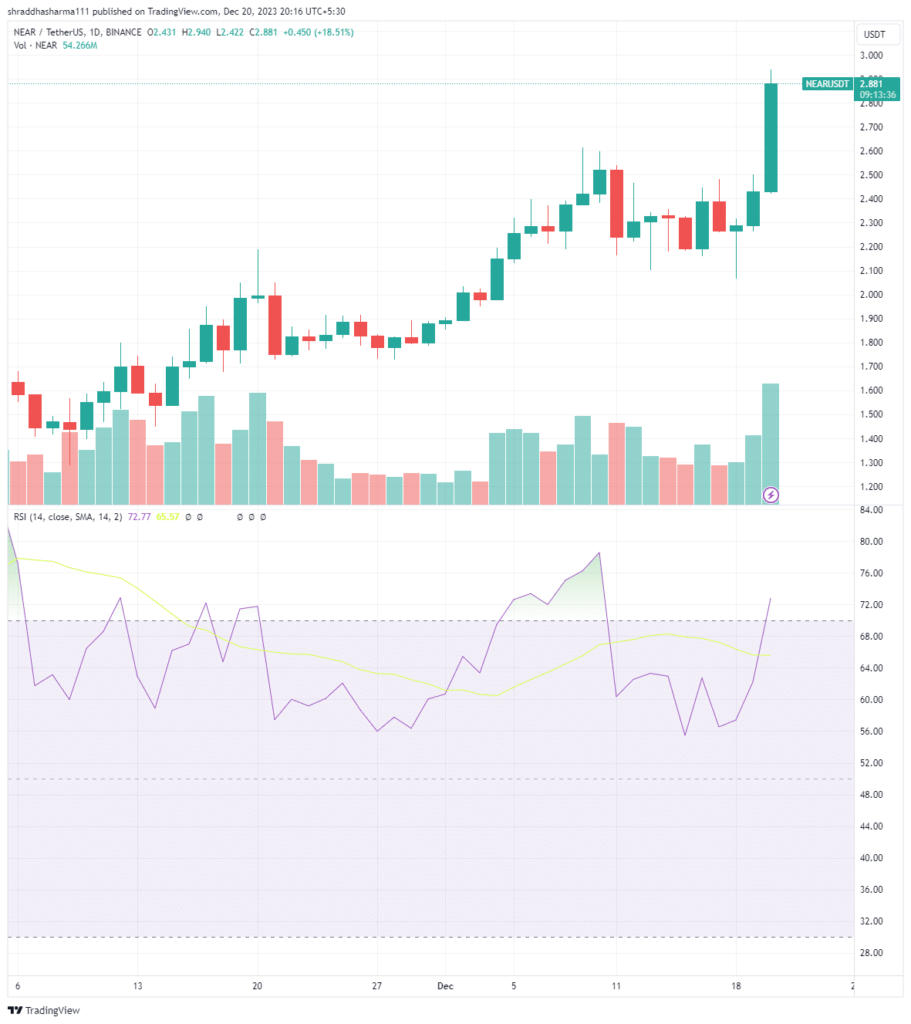 Sin embargo, el Índice de Fuerza Relativa (RSI) también revela un impulso de sobrecompra cercano a 72. Esto significa que NEAR puede estar sobrevalorándose y podría estar preparado para una inversión de tendencia o un retroceso correctivo en el precio.