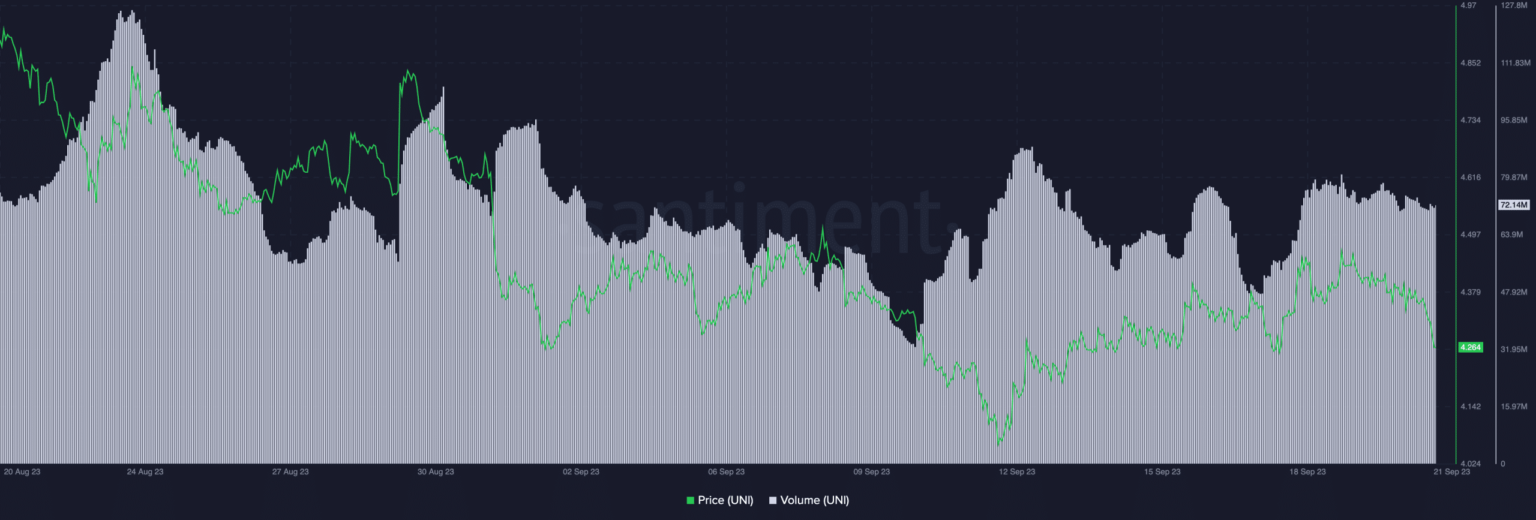 Al centrar la atención en la criptomoneda nativa de Uniswap, UNI, también enfrentó su conjunto único de desafíos. En el momento de redactar este informe, UNI cotizaba a 4,26 dólares, una disminución sustancial del precio con respecto al mes anterior.