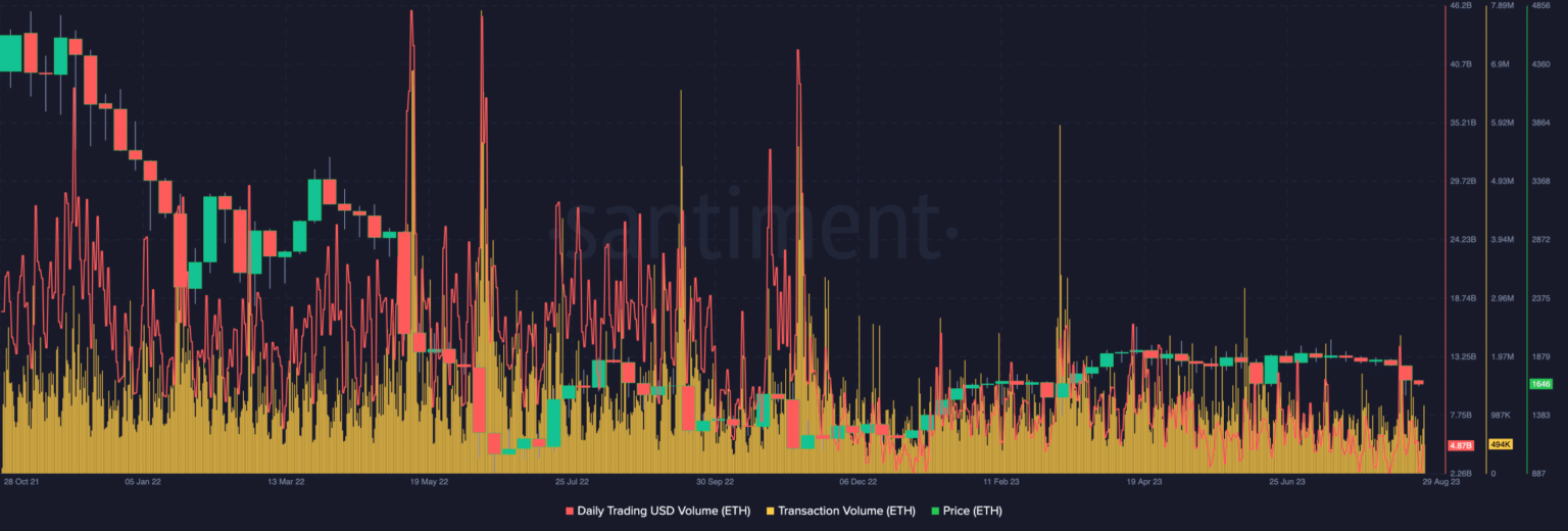 En el gráfico anterior, tanto el volumen de transacciones como el volumen de operaciones no se acercaron a los máximos registrados en 2021. Esto representa una caída notable en la utilidad de ETH.