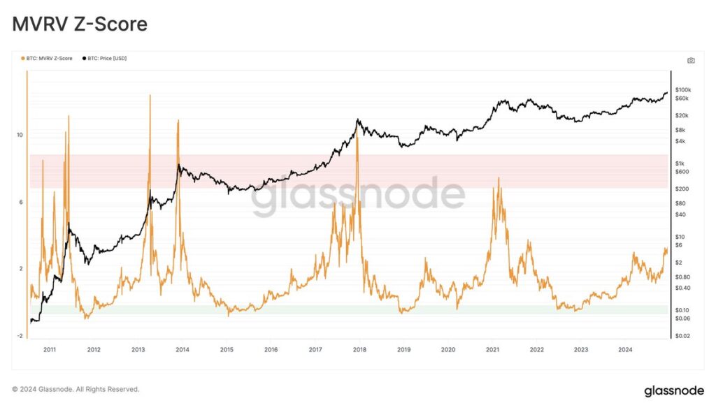 2/ Bandas de precios de MVRV: estas bandas se derivan del número de días que MVRV ha pasado en niveles extremos. Históricamente, la banda superior (3,2) se ha superado sólo alrededor del 6% de los días de negociación. Hoy en día, esta banda superior corresponde a un precio de 127.000 dólares. Dado que Bitcoin se sitúa en torno a los 98.000 dólares, el mercado aún no ha alcanzado una zona que históricamente marcó formaciones superiores.
