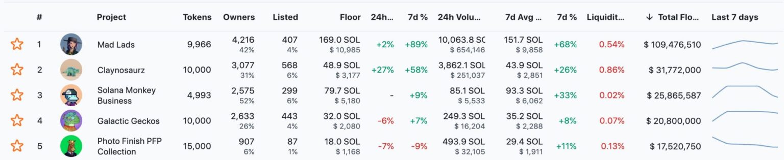 Además, el volumen de NFT de primera línea que venden Solana también creció durante este período de tiempo. En particular, en los últimos siete días, el precio mínimo de la mayoría de los principales proyectos de Solana aumentó.