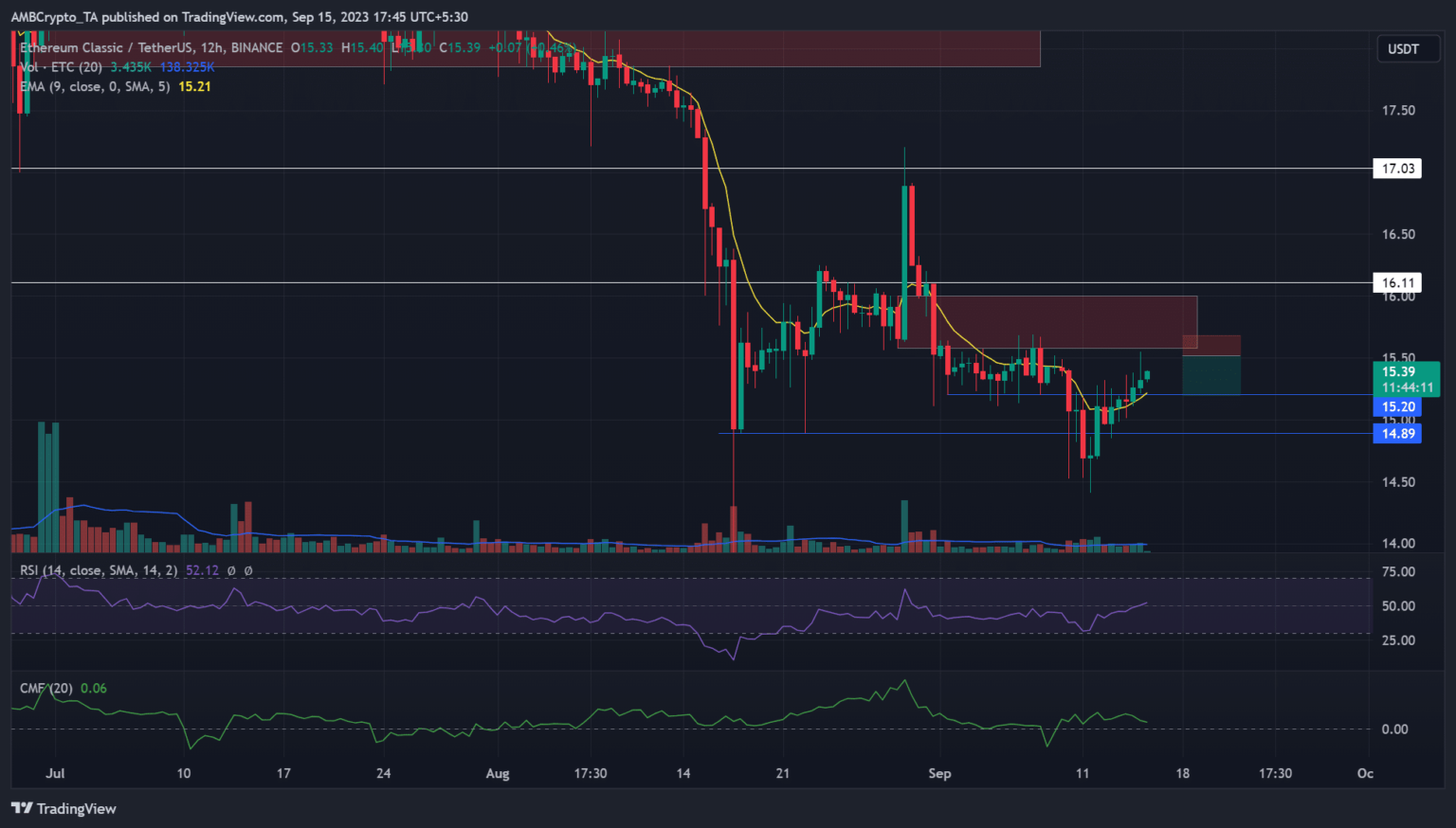 Etereum clásico [ETC] registró una modesta recuperación en la segunda semana de septiembre. La altcoin subió un 2% en el rendimiento semanal y cotizaba a 15,39 dólares al momento de esta publicación. Sin embargo, la recuperación se encaminaba hacia un obstáculo crucial y podría atraer vendedores.