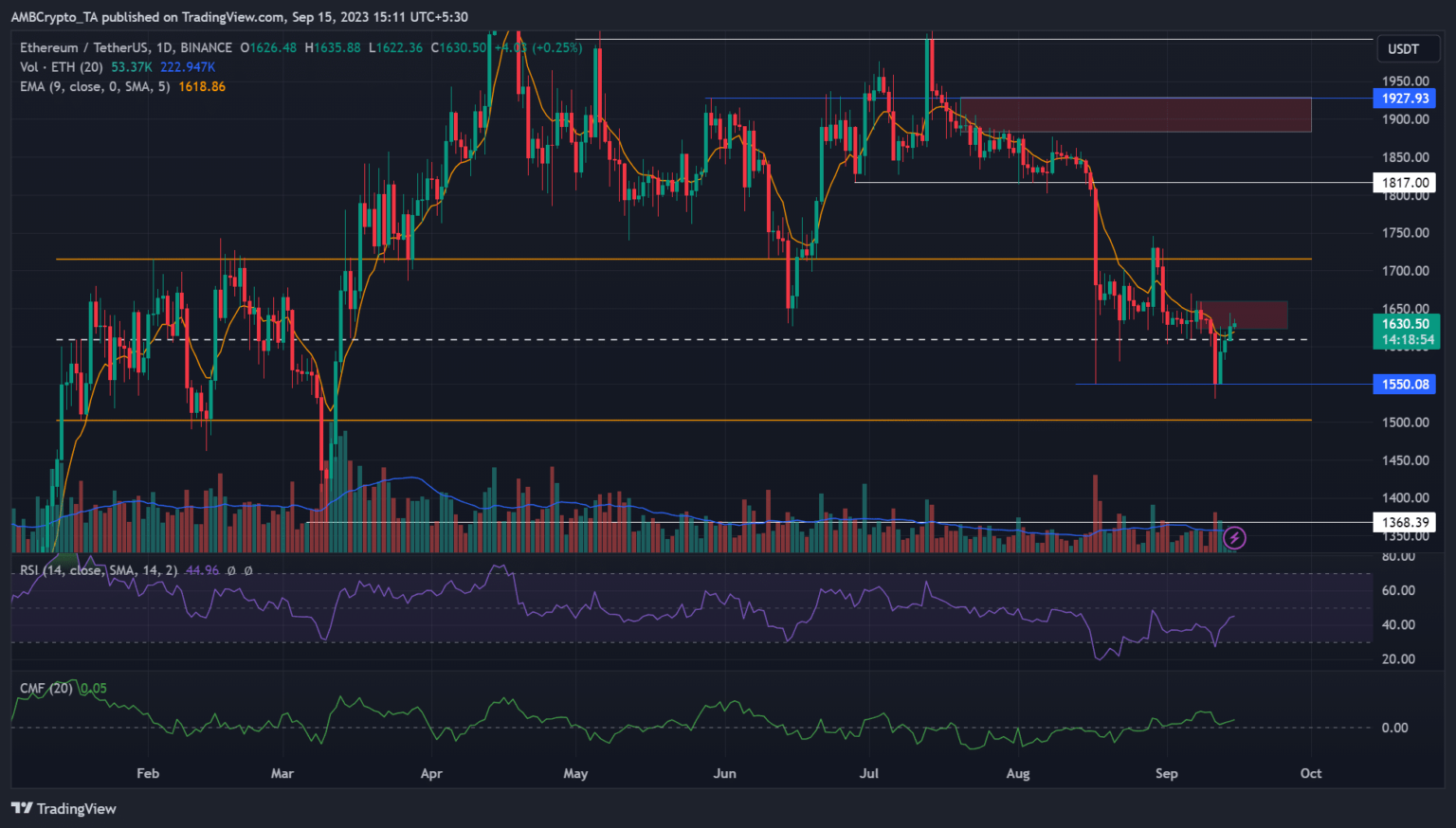 Etereum [ETH] registró ganancias de alrededor del 5% después de pasar de $1550 el 12 de septiembre a $1630 al momento de esta publicación. Pero las ganancias adicionales podrían descarrilarse si la acción del precio se topa con un obstáculo, ligeramente por encima del nivel medio.