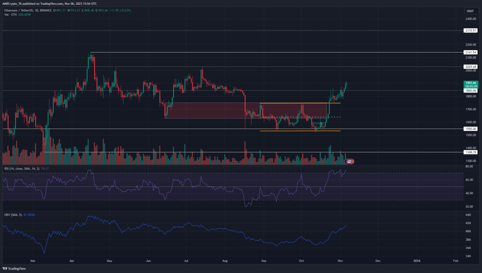 Según el gráfico de un día, la estructura del mercado y el impulso eran firmemente alcistas. El RSI estaba en 74 para reflejar lo mismo, y el volumen en equilibrio ha tenido una tendencia al alza desde mediados de octubre. Esto subrayó el hecho de que el volumen de compras ha sido mucho mayor que el volumen de ventas en las últimas tres semanas.