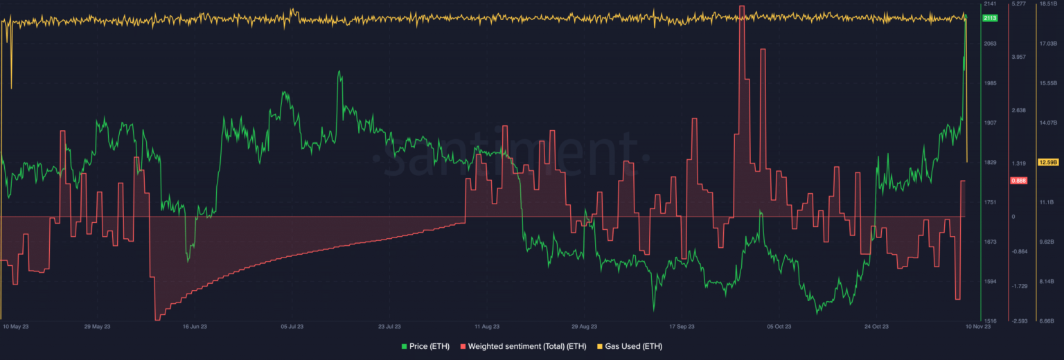 - El sentimiento en torno a ETH se disparó y el uso de la red se mantuvo igual.