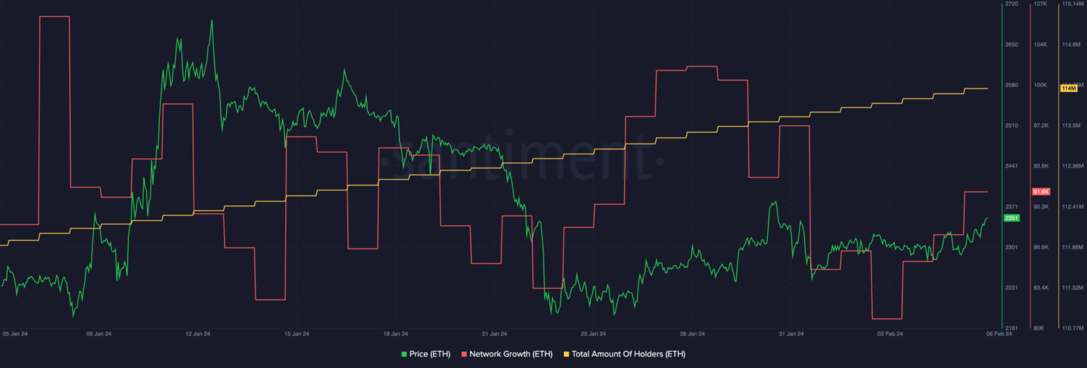 Además, el crecimiento de la red de ETH también creció durante este período, lo que implica que nuevas direcciones estaban mostrando interés en Ethereum. A medida que aumenta la acumulación, también lo hará la volatilidad en torno al precio de ETH.
