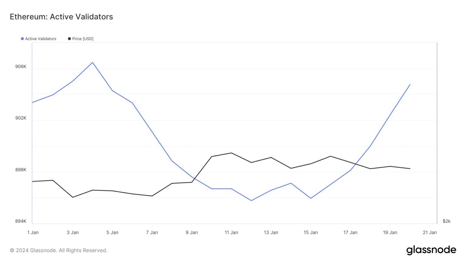 La información recuperada del proveedor de datos en cadena mostró que entre el 4 y el 12 de enero, el recuento de validadores activos en la red Ethereum cayó de 906,470 a 895,784.
