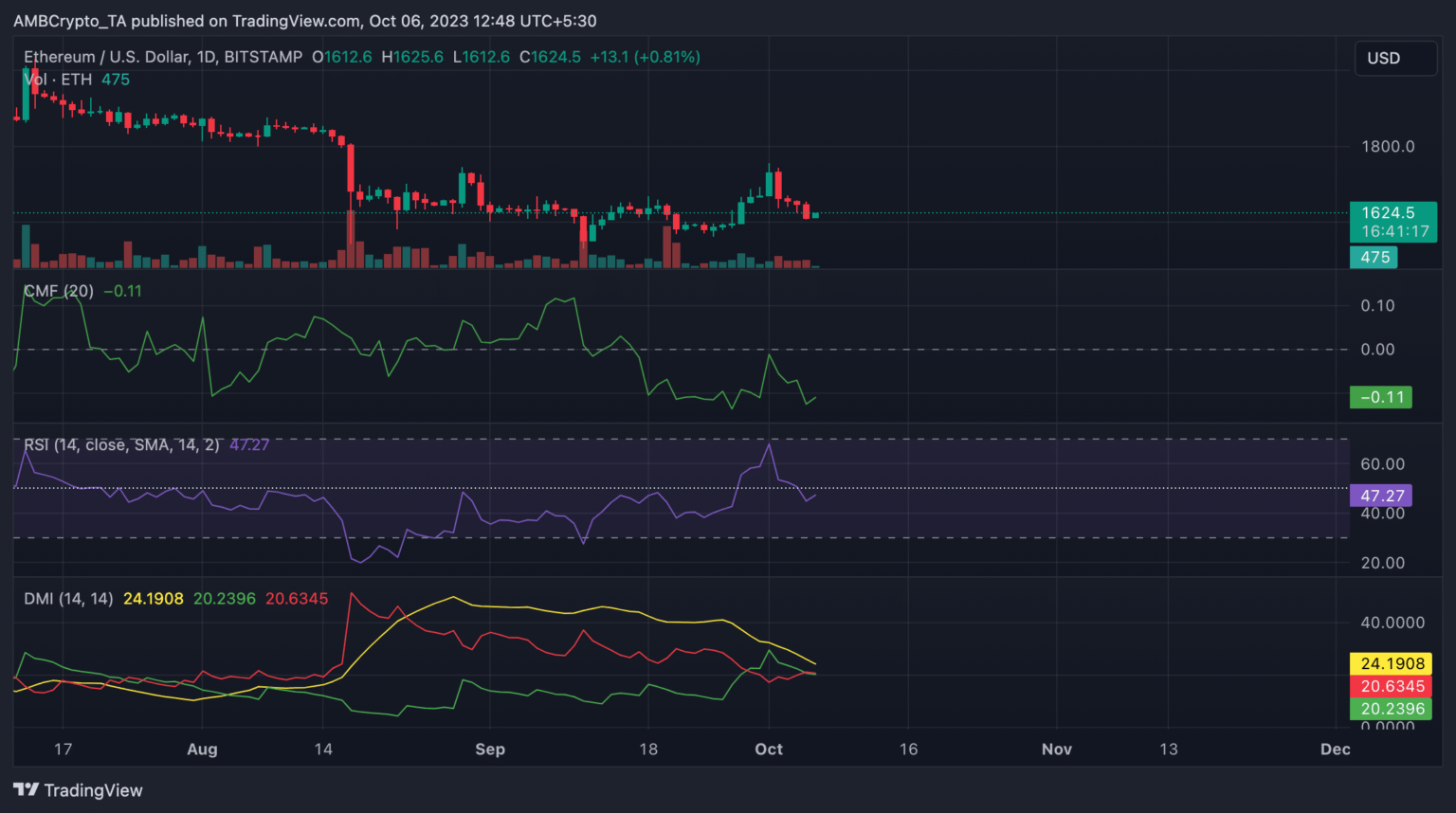 En el momento de esta publicación, la altcoin líder cotizaba a $1,620. Siguiendo a Bitcoin [BTC] breve aumento por encima de los $28,000 durante la sesión de negociación intradiaria del 5 de octubre, el precio de ETH tocó los $1648, después de lo cual perdió todas sus ganancias, según datos de CoinMarketCap presentado.