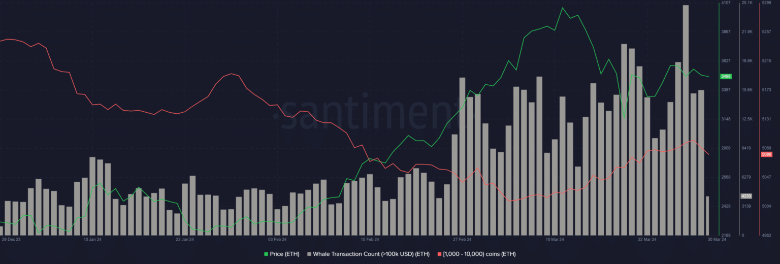 A pesar de eventos críticos como la actualización de Dencun, Ethereum [ETH] tuvo un rendimiento inferior en marzo, con sólo un aumento marginal del 0,79% durante el período de 30 días. La segunda criptomoneda más grande enfrentó una fuerte resistencia en la marca de $4,000, cayendo a $3,500 al momento de escribir este artículo.
