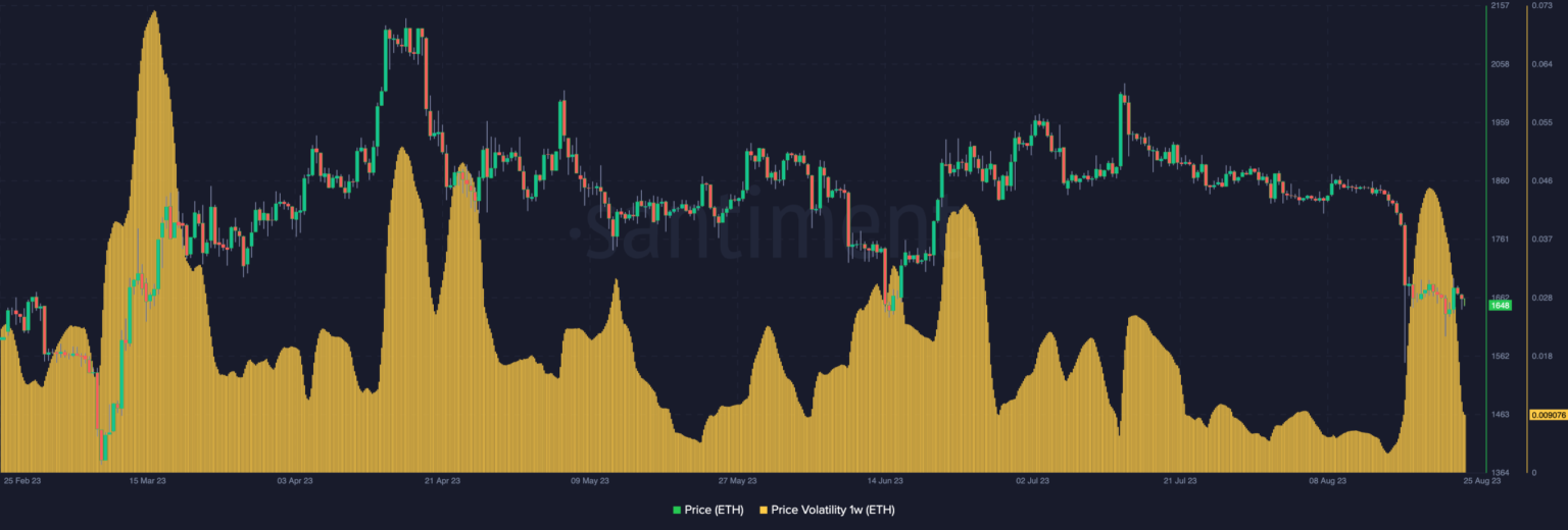 Sin embargo, la presencia de estos grandes inversores no se ha sentido con el valor de ETH. Al cierre de esta edición, ETH se consolidó, con una caída del 1,70% en las últimas 24 horas. Y según on-chain, Ethereum volatilidad de precios cayó a 0,009.