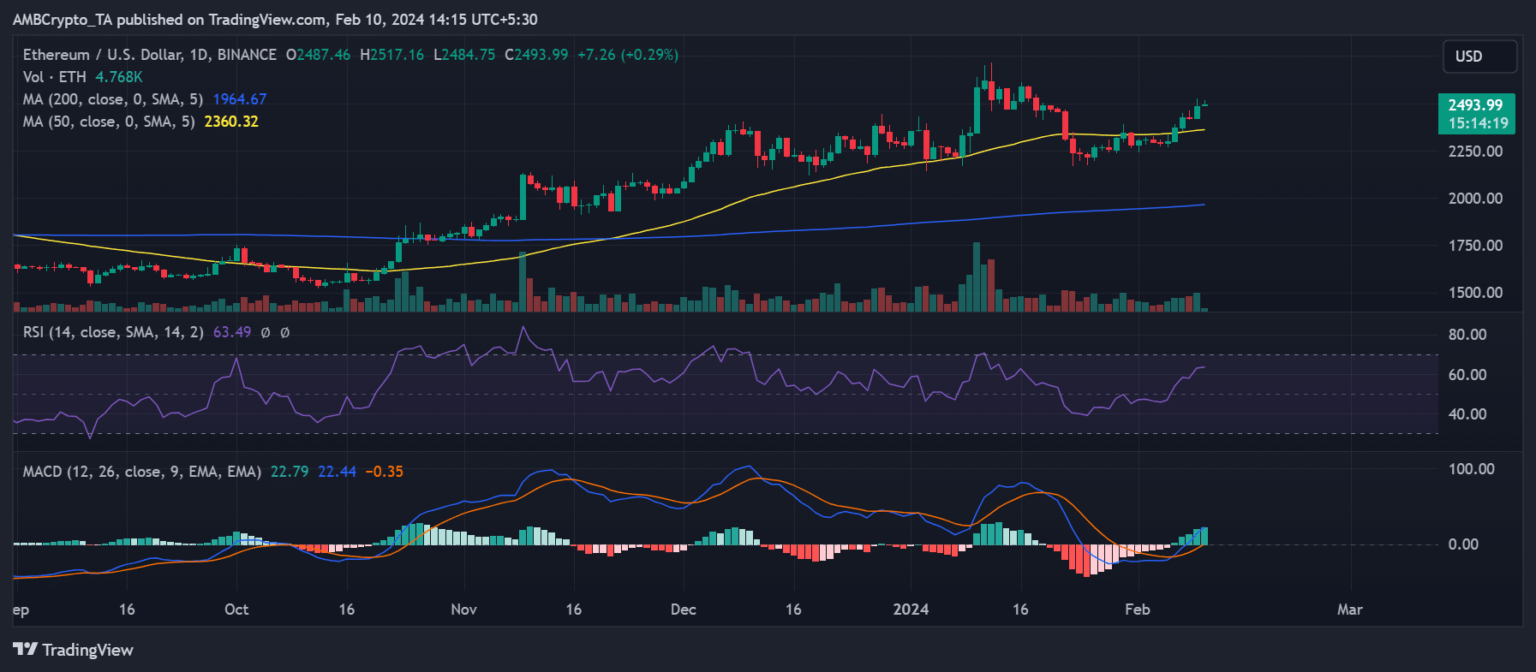 Al momento de escribir este artículo, ETH continúa su tendencia alcista, cotizando a alrededor de $2,491. El índice de fuerza relativa (RSI) ha cruzado el umbral de 60 en el momento de escribir este artículo, lo que indica una tendencia alcista. Si el impulso alcista persiste, Ethereum podría entrar en la zona de sobrecompra.