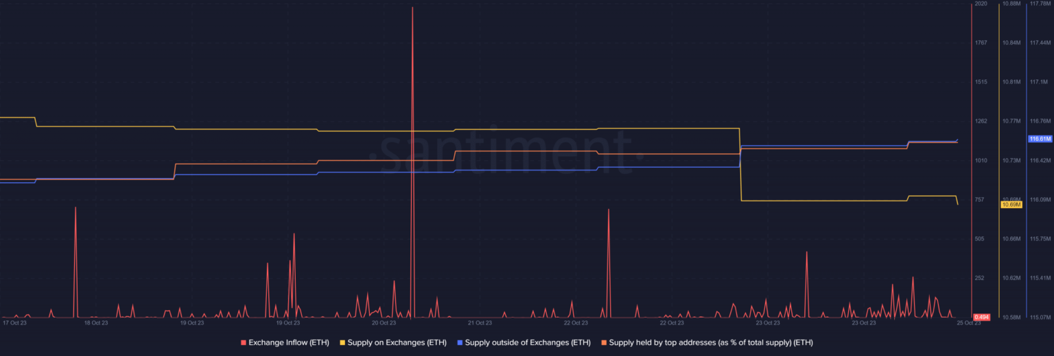 Aparte de eso, ETHLa oferta de China en las bolsas siguió siendo inferior a su oferta fuera de las bolsas. Esto indicó claramente que los inversores estaban comprando más tokens. Su salida de divisas también se mantuvo relativamente baja durante toda la semana. De hecho, la oferta en manos de las principales direcciones aumentó ligeramente.