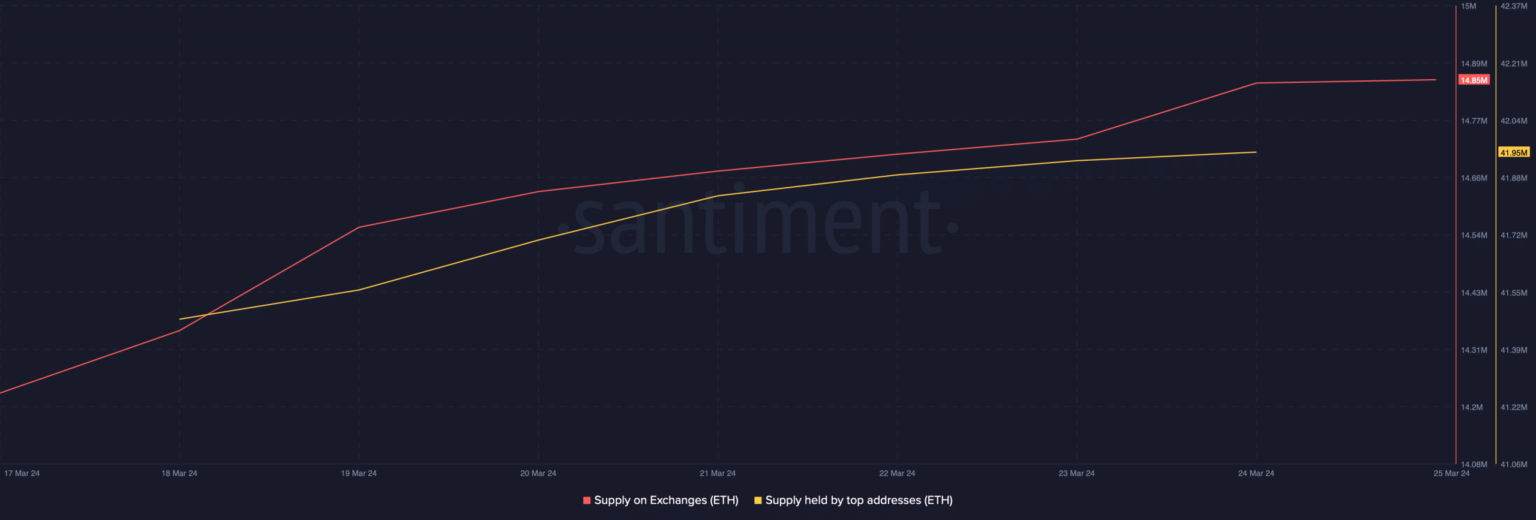 AMBCrypto descubrió que al momento de esta publicación, la presión de venta sobre ETH era alta. Esto fue evidente por el aumento de su Oferta en Bolsas.