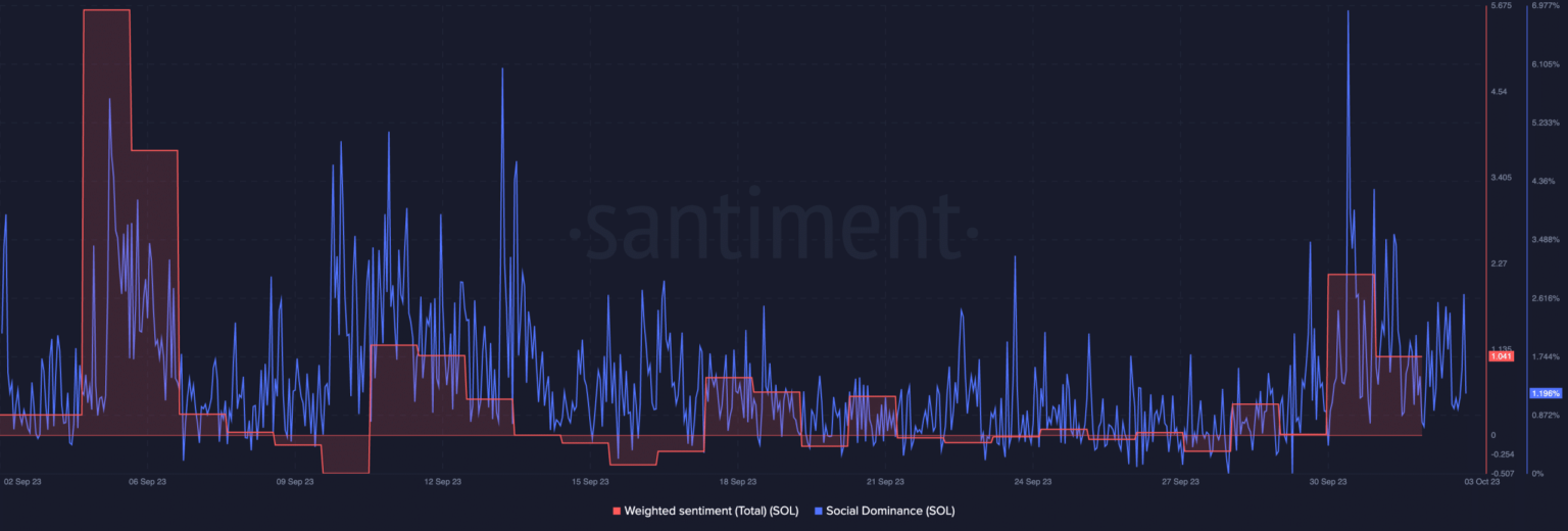 Como puede verse, el sentimiento ponderado de SOL cayó el 2 de octubre, lo que indica que el mercado no estaba exactamente a favor de la altcoin. Además, una caída en el dominio social fortaleció la noción de menciones menores del alt en el frente social.