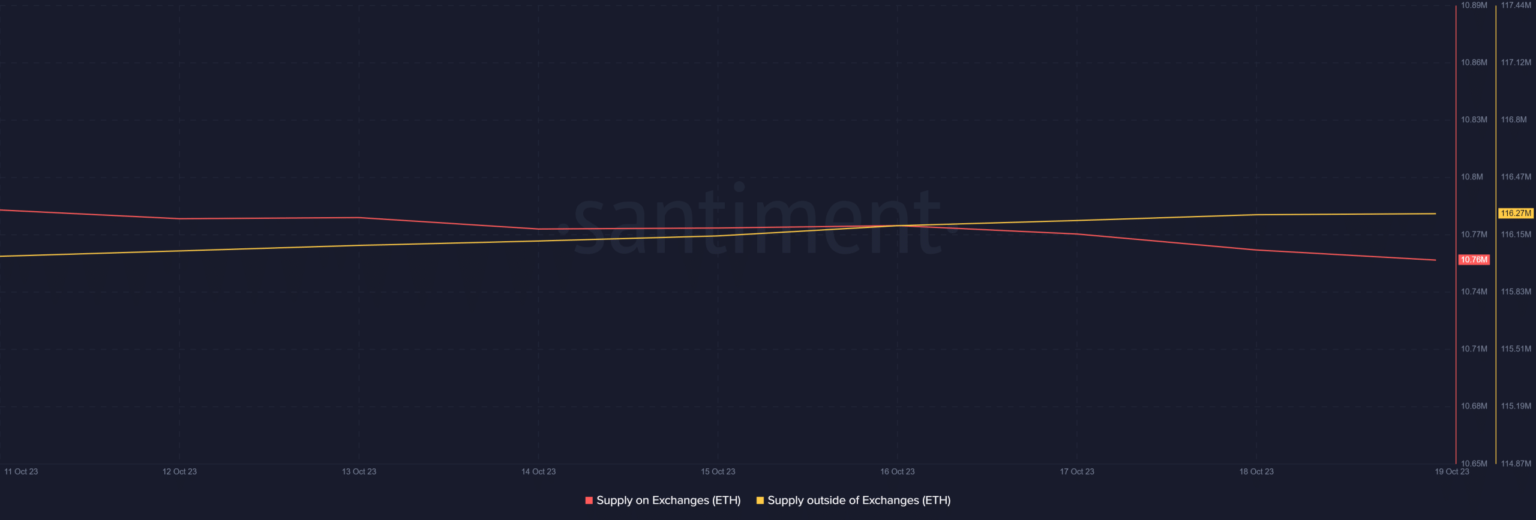 Sin embargo, los datos de Santiment cuentan una historia diferente, ya que el suministro de Ethereum fuera de los Exchanges invirtió su suministro en los Exchanges, lo que significa que los inversores estaban acumulando más tokens.
