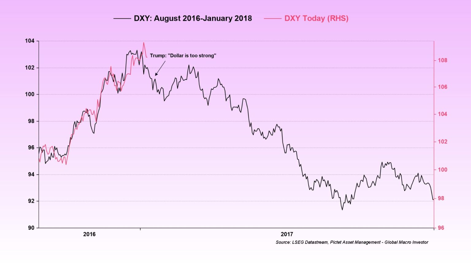 Aunque el panorama económico y geopolítico ha cambiado desde el primer mandato de Trump, algunos observadores del mercado ven paralelismos con su retórica de 2017. En aquel entonces, arremetió contra el dólar estadounidense que consideraba “demasiado fuerte”, postura que precedió a una notable caída de la moneda. El índice del dólar estadounidense (DXY) alcanzó un máximo cercano a 104 a principios de enero de 2017, pero comenzó una tendencia a la baja que se extendió hasta principios de 2018, tocando fondo alrededor de 98.