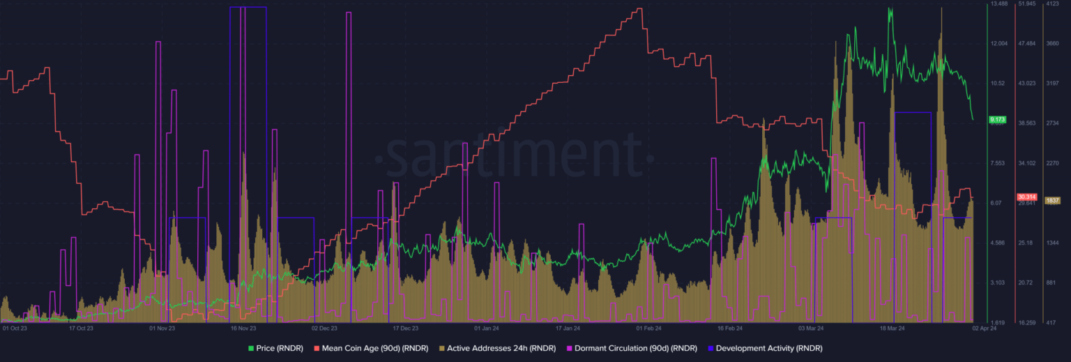 Estos picos rivalizaban en tamaño con los de finales de diciembre. La métrica es otra que generalmente subraya un aumento repentino en la actividad de ventas. El precio del RNDR se mantuvo estable por encima de los 10,5 dólares durante la mayor parte de marzo. La presión vendedora de los últimos dos días hizo que los compradores finalmente sucumbieran.