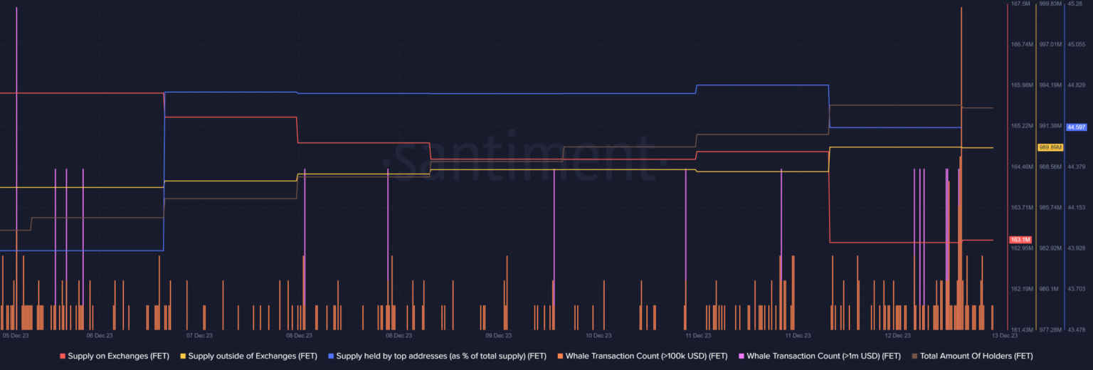 No solo eso, sino que las ballenas también compraron FET ya que su oferta en manos de las principales direcciones registró un aumento el 7 de diciembre de 2023, lo que sugiere claramente que los grandes jugadores en realidad esperaban que el precio del token aumentara.