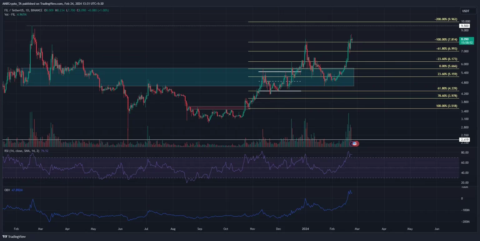Archivocoin [FIL] tuvo una actuación estelar en las últimas tres semanas. Volvió a probar la zona de soporte del marco temporal más alto en el área de $4,6-$5,6 y subió un 76% desde el 5 de febrero para alcanzar $8,57. Parecía probable que estuviera en juego un movimiento hacia los 9,5 dólares.