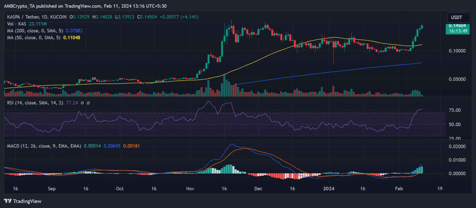 La mirada de AMBCrypto a su gráfico de tiempo diario reveló una tendencia alcista consecutiva de cinco días durante la semana pasada, que continuó al momento de escribir este artículo. KAS cotizaba a alrededor de 0,14 dólares, lo que refleja un aumento de más del 4%.
