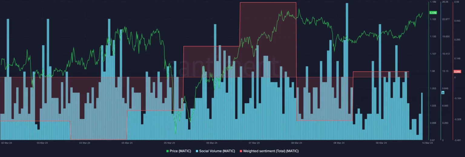 En el momento de esta publicación, Polygon cotizaba a 1,18 dólares con una capitalización de mercado de más de 11.600 millones de dólares. Como resultado, el volumen social del token se mantuvo alto durante la última semana.