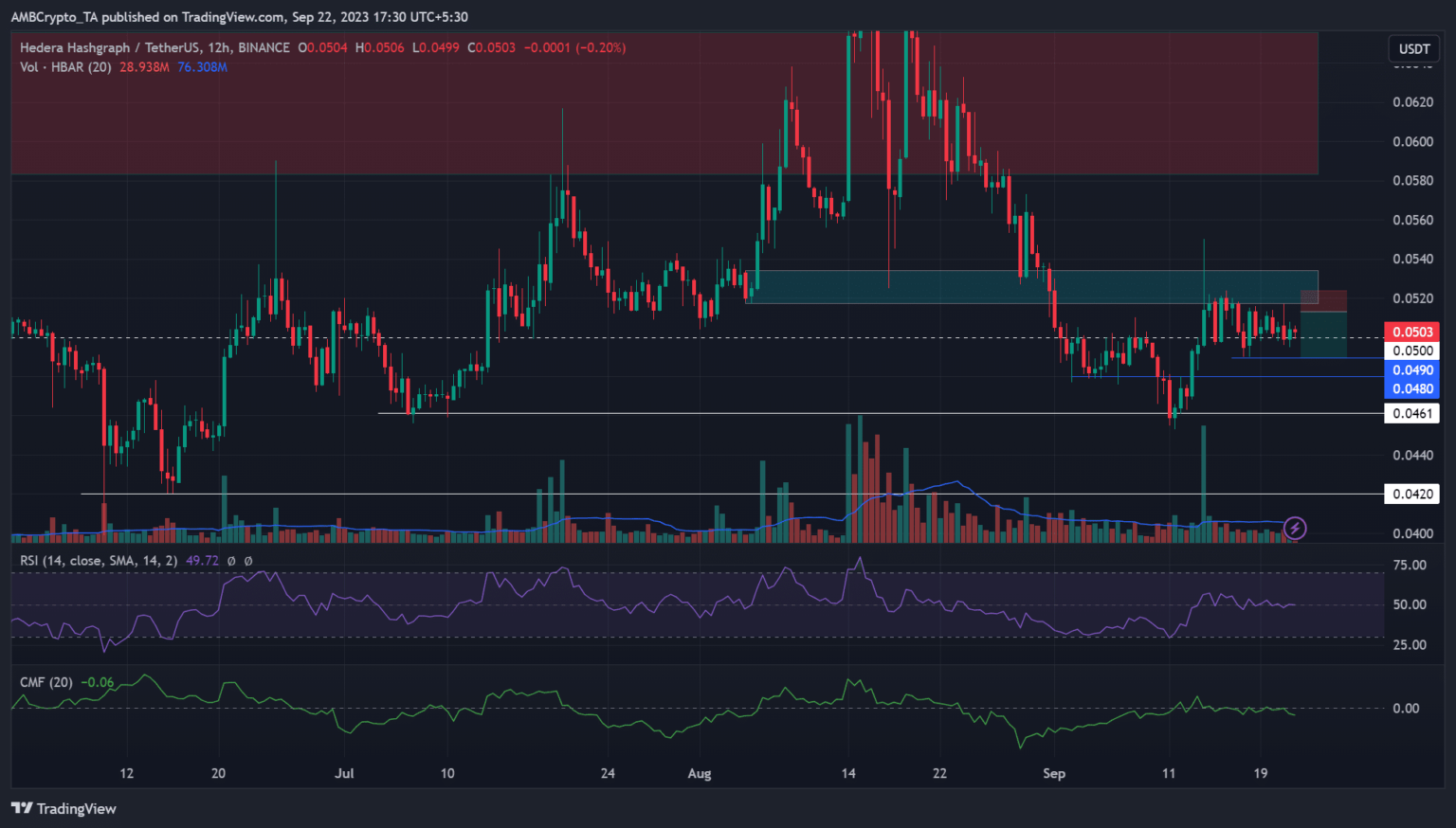 - HBAR no pudo superar la zona de resistencia de 0,0520 dólares.