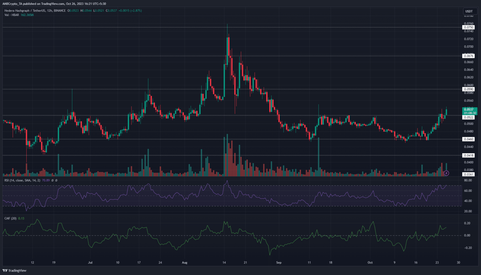 Hedera [HBAR] continuó su fuerte recuperación desde el soporte de $ 0,046 al reclamar otro nivel de soporte en la zona de precio de $ 0,052. Las ganancias del 6,1% durante el último día estimularon la ruptura alcista por encima de la resistencia, como se vio en el período de 12 horas.
