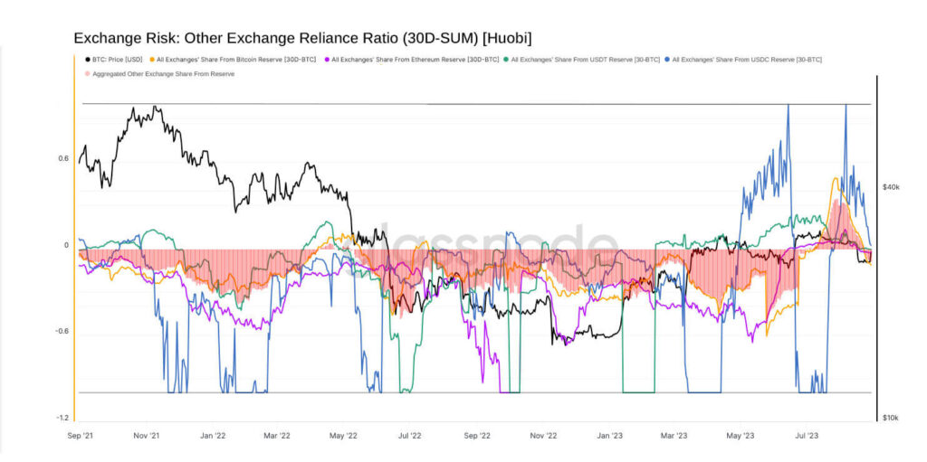 Si bien Binance y Coinbase exhiben un índice de dependencia relativamente bajo, lo que indica movimientos menores de fondos en comparación con sus vastos saldos, los datos de Huobi pintan un panorama diferente. Las cifras recientes mostraron índices de dependencia negativos pronunciados en todos los activos de Huobi, lo que indica un marcado aumento en las transferencias de Huobi a otros intercambios.