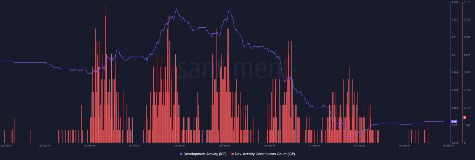 Sin embargo, la mirada de AMBCrypto a los datos de Santiment reveló una historia diferente. Descubrimos que las cosas cambiaron en marzo cuando la actividad de desarrollo de Internet Computer disminuyó en los últimos días.