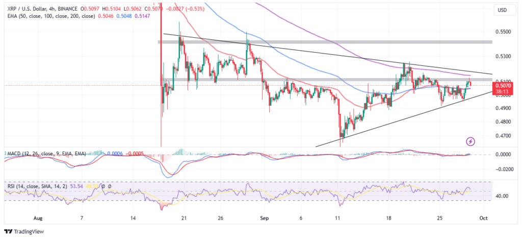 El precio de XRP se mantiene por encima de 0,5 dólares, un nivel de soporte inmediato pero fundamental reforzado por una confluencia de la media móvil exponencial (EMA) de 50 (rojo) y la EMA de 100 (azul). XRP debe mantener este nivel, lo que podría servir como trampolín hacia el precio mientras los alcistas buscan reanudar la tendencia alcista.