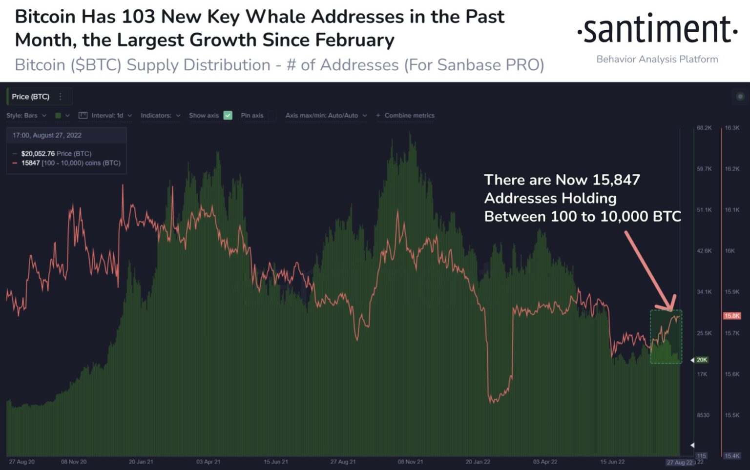 Existe una correlación entre el precio de BTC y la cantidad de direcciones que contienen de 100 a 10 000 BTC, y han subido 103 en los últimos 30 días”.