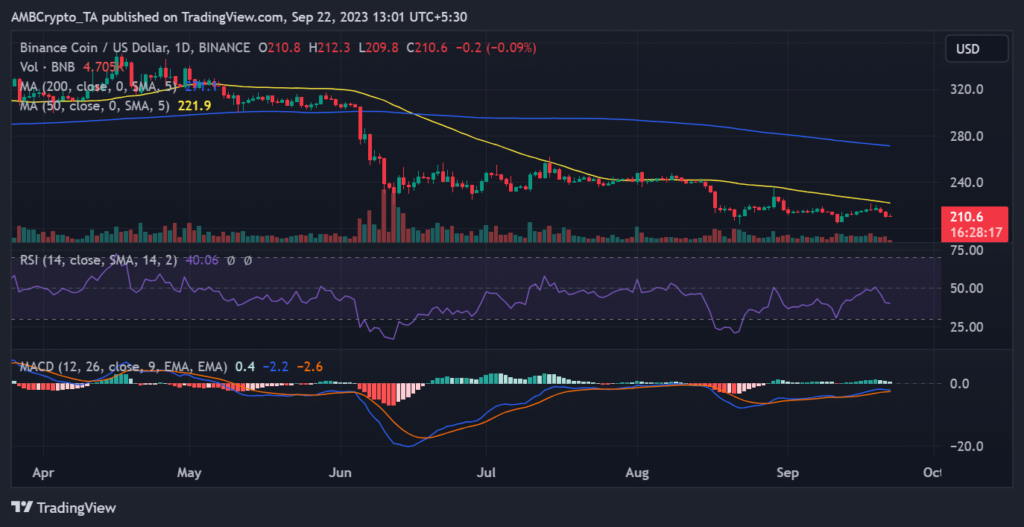 El 21 de septiembre, cuando Binance hizo su movimiento legal, el valor de BNB disminuyó más de un 1,6% y se cotizaba a 210,8 dólares. En el momento de escribir este artículo, estaba experimentando una ligera pérdida de menos del 1%, rondando los 210,7 dólares.