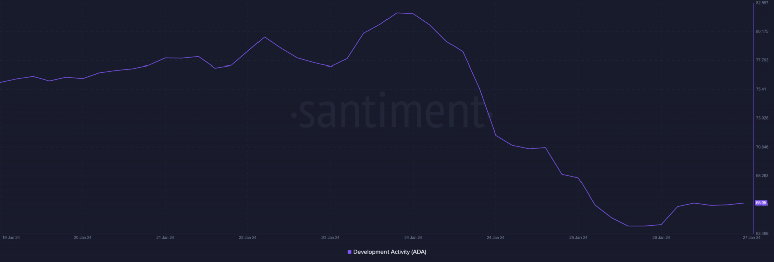 La mirada de AMBCrypto a los datos de Santiment reveló que el desarrollo de blockchain cayó la semana pasada. Esto se desprende del hecho de que el gráfico de actividad de desarrollo de ADA ha disminuido en los últimos días.