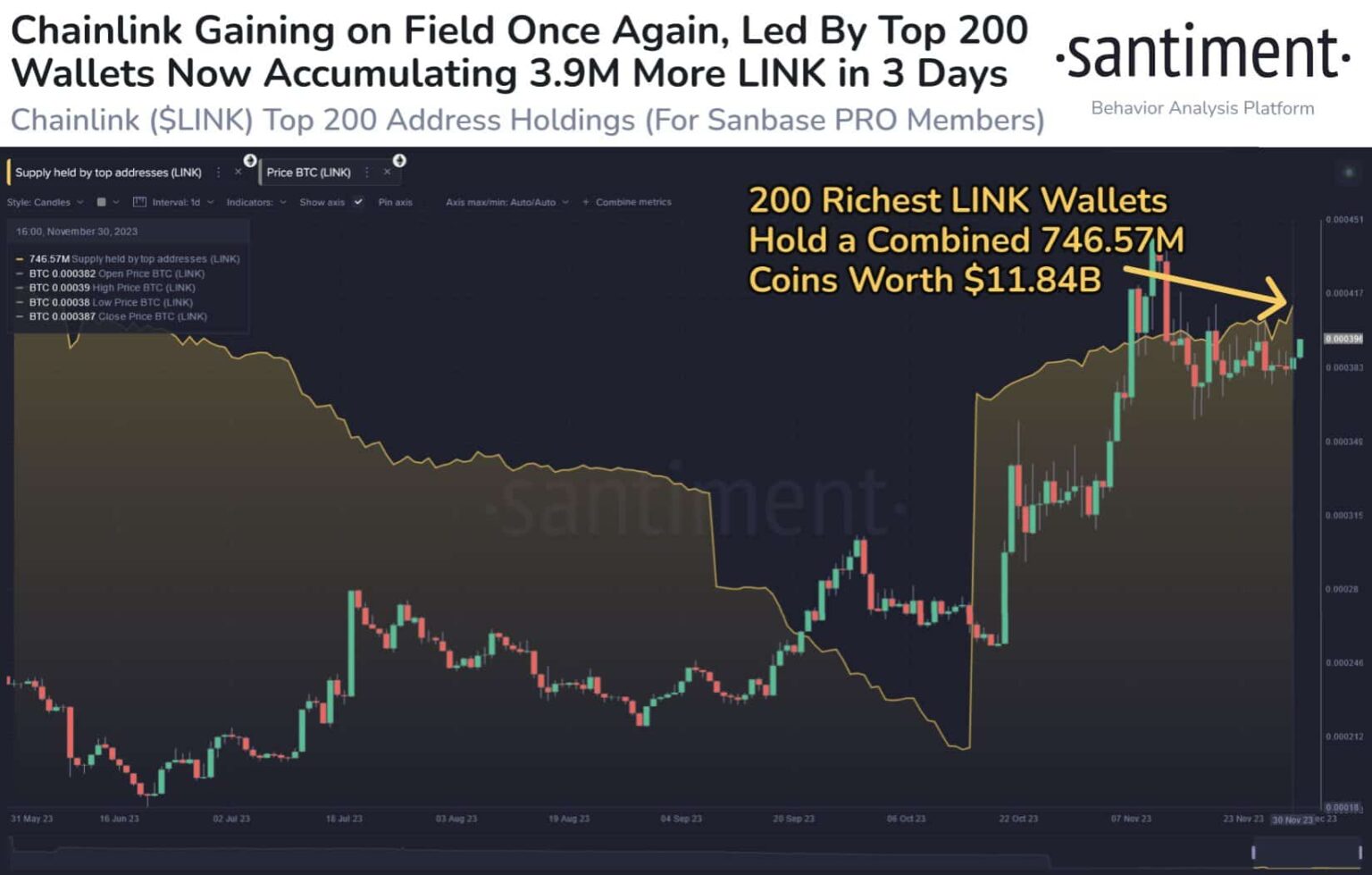 La plataforma de análisis de datos Onchain Santiment muestra que durante las últimas cinco semanas, las 200 billeteras más grandes han agregado estratégicamente la asombrosa cantidad de 50 millones de dólares en LINK a sus tenencias.
