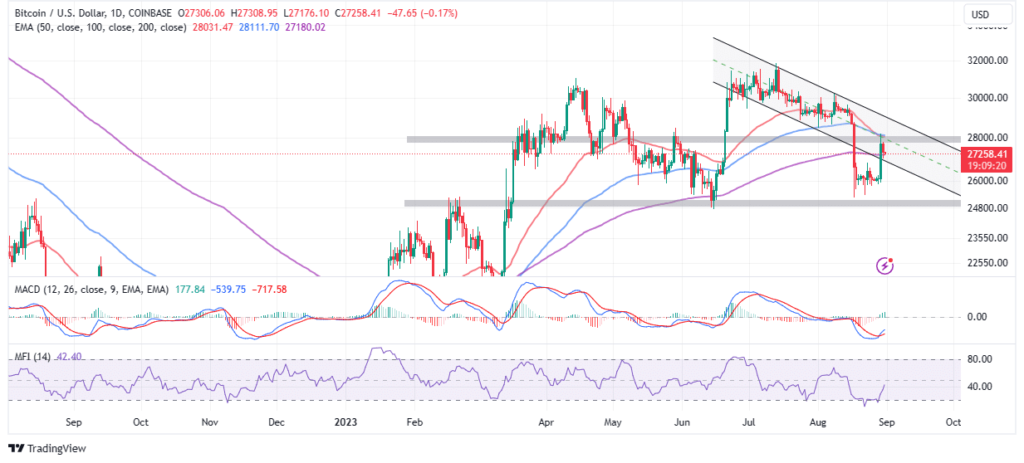 Una ruptura por encima de los 28.000 dólares y el límite superior del canal descendente podrían marcar el comienzo del repunte por encima de los 30.000 dólares.