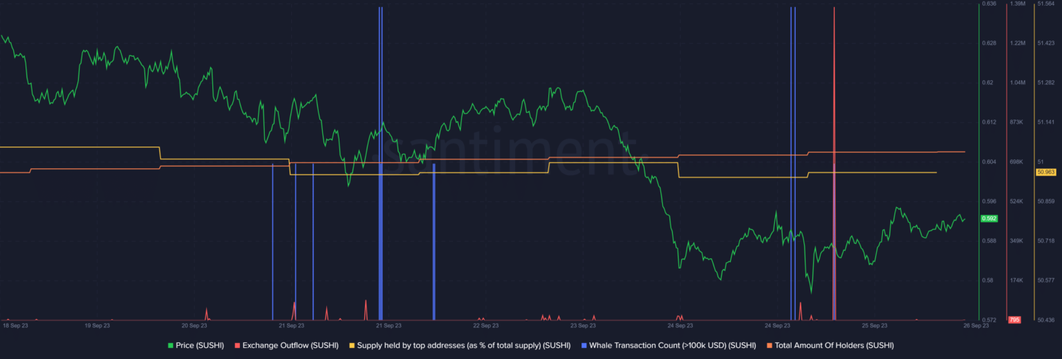 Pero a pesar de esto, la oferta de DEX en manos de las principales direcciones se estabilizó, al igual que su número total de titulares. Además, la salida de divisas de SushiSwap se disparó sólo una vez en los últimos siete días, otra señal preocupante.