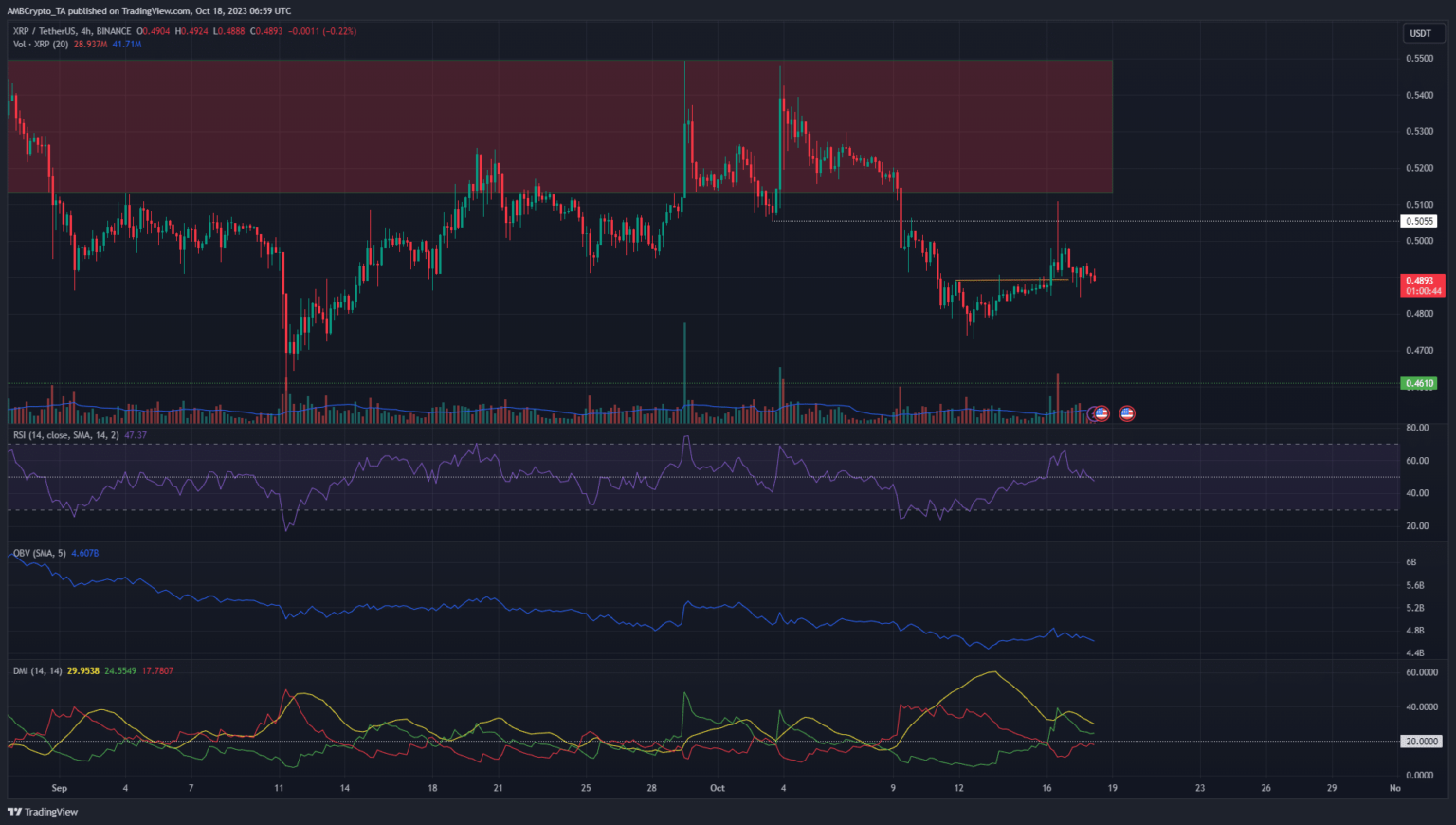 El movimiento por encima del reciente máximo más bajo de 0,489 dólares (naranja) hizo que XRP cambiara su estructura de mercado de manera alcista. El RSI también subió por encima del nivel neutral 50. El DMI vio que tanto el ADX (amarillo) como el +DI (verde) saltaban por encima de 20.