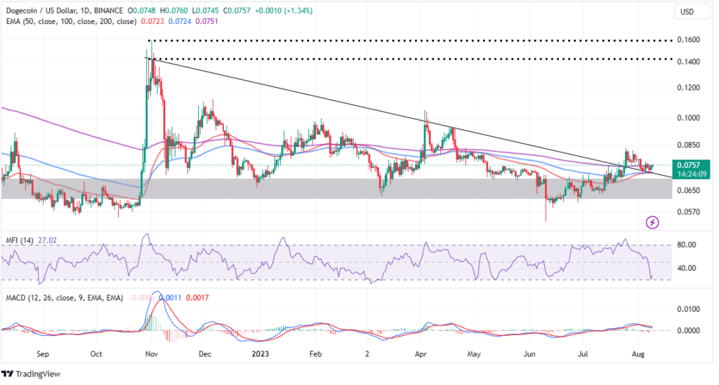 La moneda meme más grande, DOGE, ha mejorado su perspectiva técnica en las últimas 24 horas a $ 0.0754, con $ 365 millones en volumen de operaciones y $ 10.6 mil millones en capitalización de mercado.