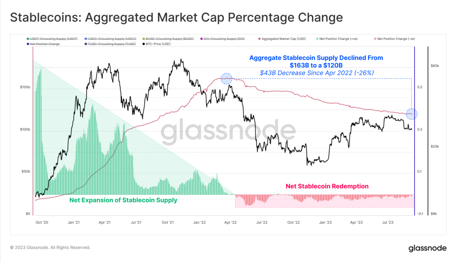 Este aumento en el canje de monedas ha resultado en una disminución del 26% en el suministro agregado de monedas estables, descubrió Glassnode. Desde abril de 2022, esta cifra ha caído de 163.000 millones de dólares a 120.000 millones de dólares, con una liquidación de 43.000 millones de dólares registrada.